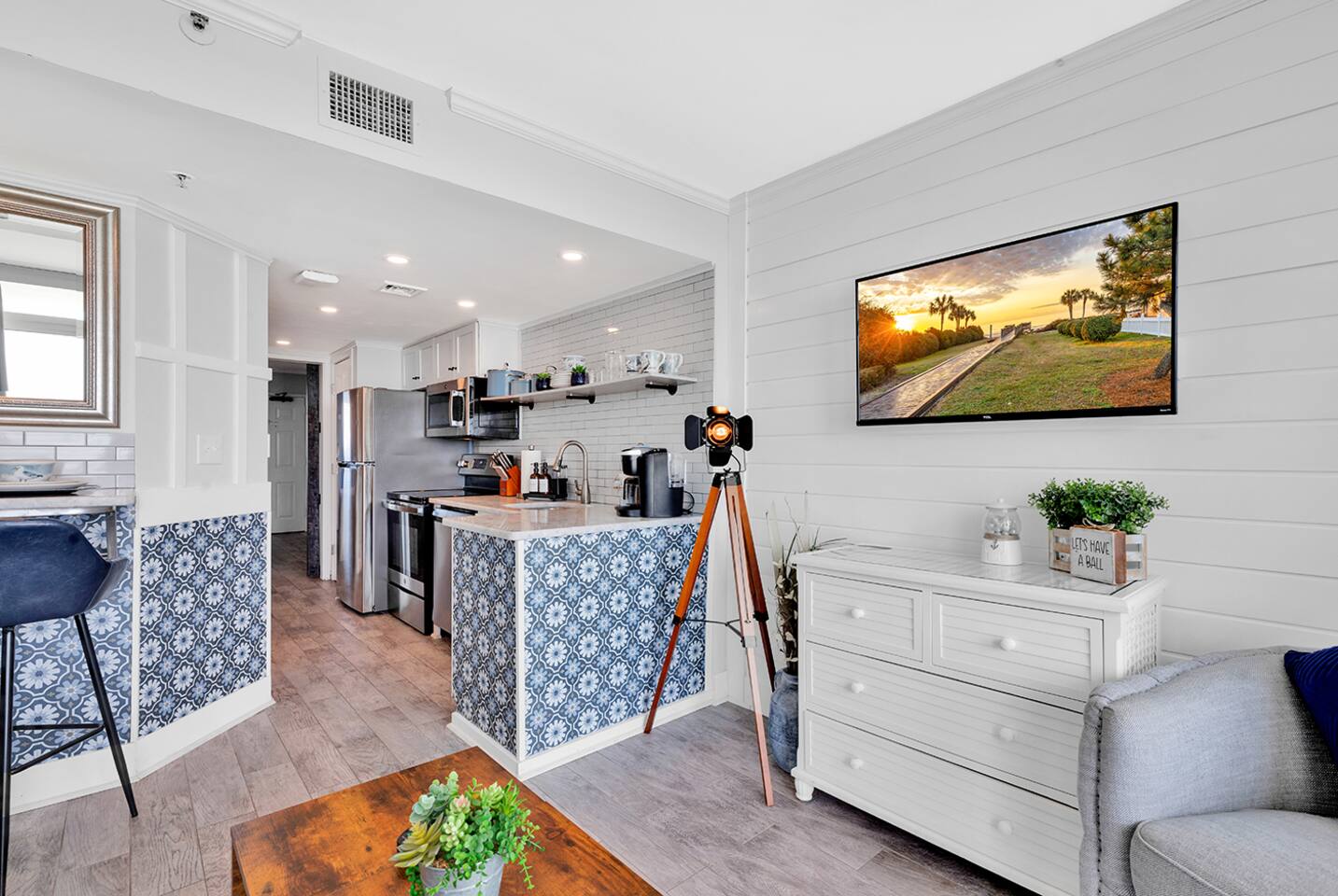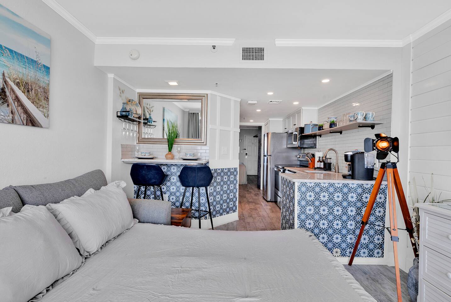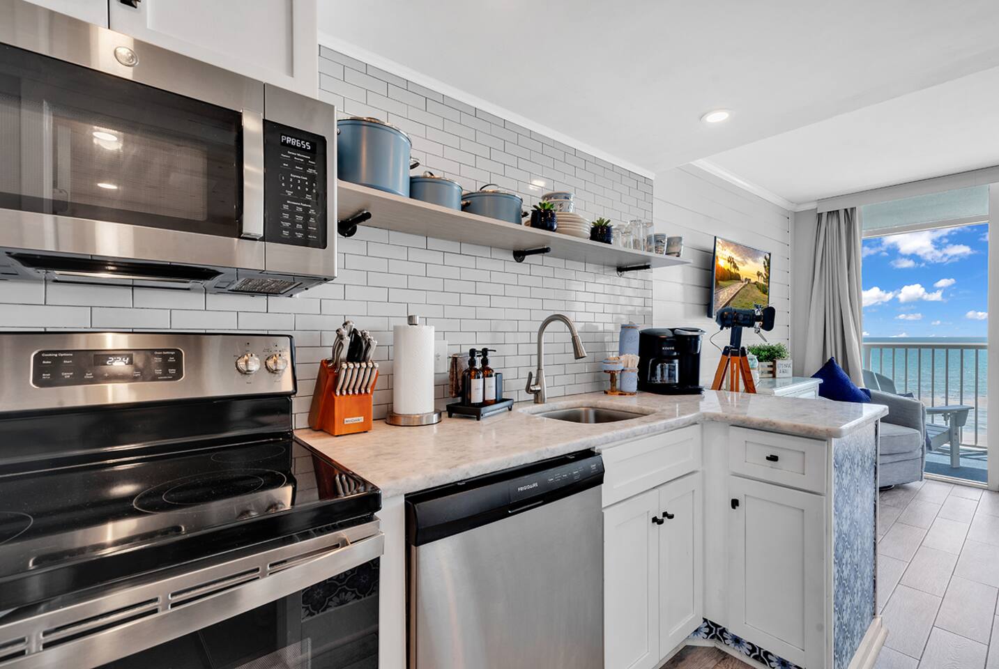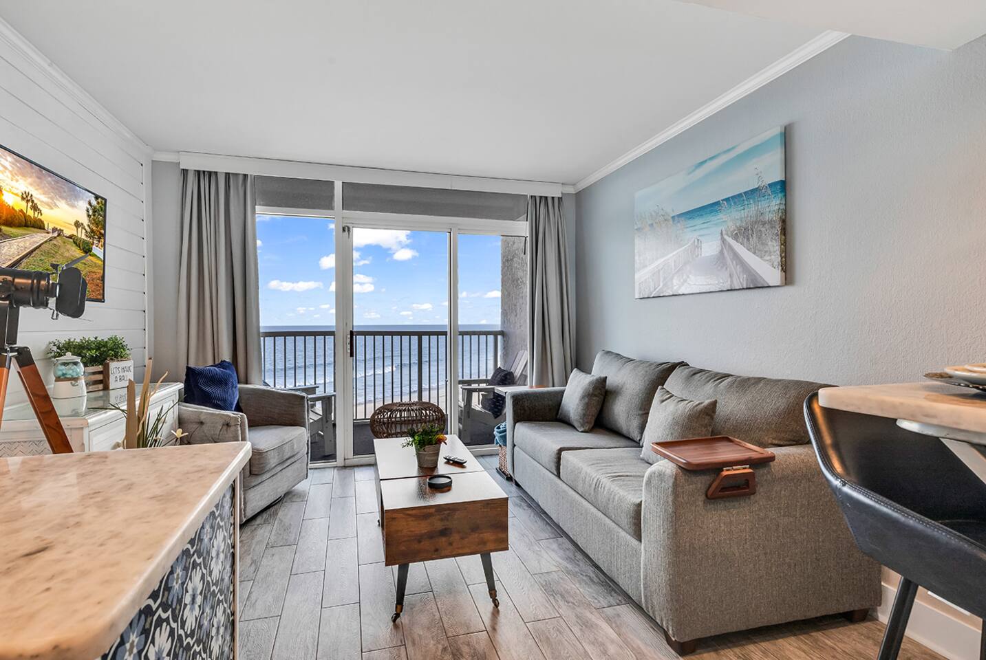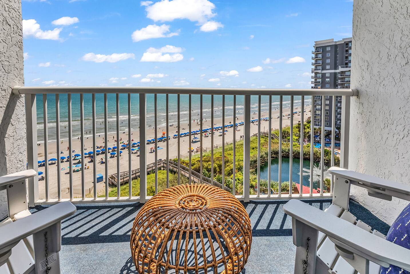 The Shorebirds Retreat accommodates up to 4 guests and features: - Direct, Beach Access - Complimentary Wi-Fi - Fully equipped kitchen - Complimentary parking - Self check-in upon arrival - Private, oceanfront balcony - 2 Backpack Beach Chairs & Picnic Basket for effortless fun-in-the-sun - Gated community to ensure your safety and enjoyment during your stay Master Bedroom: The Master Bedroom features a comfortable king size bed, flat screen smart TV and tasteful shorebirds decor. Set your worries to snooze and allow the premium pillow top mattress, memory foam pillows and lightweight coverlet give you just the right dose of Vitamin Sea you need. Bathroom: The Bathroom features a starter supply of toilet paper, full set of bath towels, hand towels & washcloths, shower/tub combination, vanity and travel sized soap, shampoo & conditioner. Kitchen: Oceanfront meal prep made easy with: - Pots & Pans - Serving utensils - Stainless Steel Oven - Full set of chef knives - Collapsible storage bowls - Stainless Steel Refrigerator - Cutlery, plateware & drinkware - Full sized-stainless steel dishwasher - Assorted Bakeware including a 14” Pizza Pan - Dual Keurig, suitable for k-cups and ground coffee - Kitchen appliances to include an air fryer, blender, slow cooker & toaster Living Area: Soak in the spectacular beauty of the Atlantic Ocean while streaming all your favorite shows on the Smart TV. Full-sized sleeper sofa appointed with comfortable linen and pillows nestled either in the coffee table or at the top of the closet in the bedroom. Dining Area: The shared dining area includes a dinette bar, shorebirds plate settings and wine glass wall mount with seating for 2. Private Balcony: The sound of ocean waves crashing on the shore and the serene sunrise and sunset are the norm while sipping your favorite beverage on the private balcony. Each adirondack chair has a private cupholder under the chair arm and footstool nestled underneath the seat. Simple pull-out feature allows for easy transition from a standard chair to a cozy lounge in seconds. Other things to note: To make your travels light and easy, our Welcome Starter pack provided includes the items, below: - Trash bags - Toilet Tissue - Picnic Basket - Paper towel roll - Luggage Rack (2) - Coffee K-cups (4) - Dishwashing liquid - Dishwasher tab (1) - Iron & Ironing Board - Travel size Shampoo - Travel sized Bar Soap - Travel size Conditioner - Bath & Hand Towels (4) - Backpack Beach Chairs (2) As it is custom with condo rentals, any items needed beyond the provisions, above, will need to be supplied by guests. Be sure to bring your sunscreen, pool towels, pool floaties, heavy blankets & any other items you desire while on vacation! For longer stays, we do not provide laundry service but laundry facilities are available on the lobby level for your use using coins or the ShinePay app. Motorcycles are prohibited on the resort property from May 1st - August 31st.